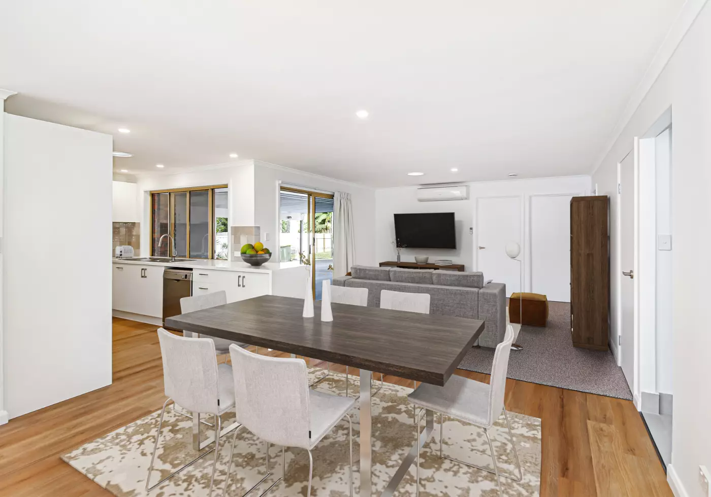 Two separate living areas surround a centralised kitchen and dining area that is sleek and modern, with a coastal feel and a servery to the outdoor entertaining area.
