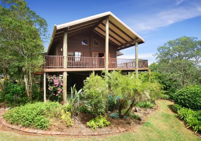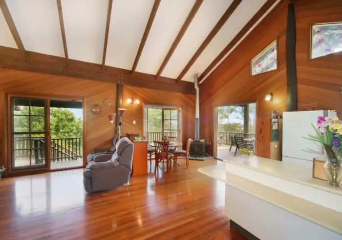 Accommodation - The home is built with sturdy pole construction. A steep roof line grants the home unique character externally and creates the soaring internal ceilings. Verandahs on three sides with the East facing one designed with a peaked roof to allow the morning sun in to warm and light the home. Natural cooling and heating is augmented by a slow combustion stove to create low cost, low impact living year round. Solar power and a solar hot water system allows the current owners to live free of power costs.