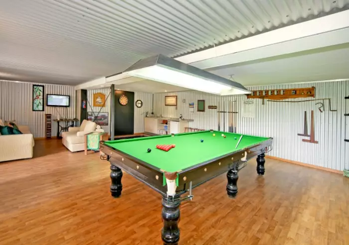 Accommodation the home is built to last with hardwood frames behind western red cedar. There are four extra large bedrooms, ensuite and a perfect kitchen, ceaser stone and two pack of course. There are two living areas, which you will hardly use, because you will spend all your time on the totally private and weather protected veranda. On the main level is the double garage and laundry so it is effectively one level living. However there is a big bonus down below. Every man's dream club room can offer all the required necessities; billiard table, darts, tv, sink and bar. All you need to bring is your mates. If you're not allowed back upstairs there is an extra bathroom and bedroom down here. This area is perfect for the teenager or university student or has the potential for dual living.