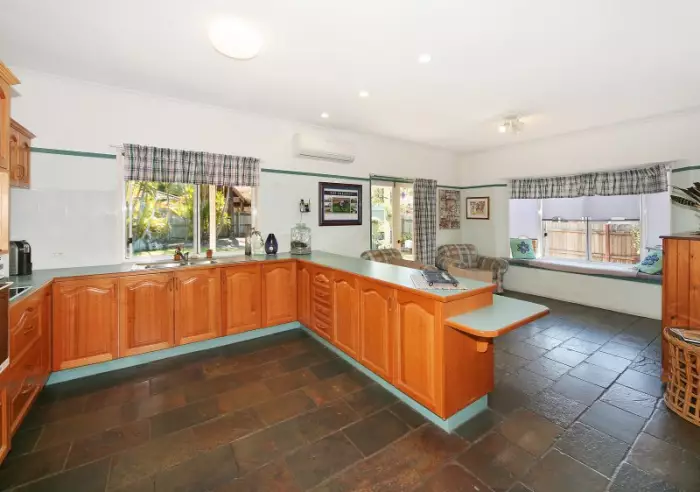 Accommodation - Internally the floor plan works beautifully with formal lounge dining balanced by family room and kitchen. The Tasmanian Oak kitchen is immense, so we don't expect any complaints about a lack of cupboards or benches. A sunny bay window seat is a neat idea for a lazy read of the Sunday papers. The high ceilings throughout the home give it a grand spacious feel.