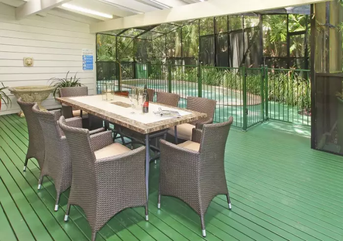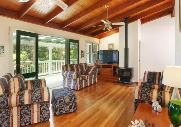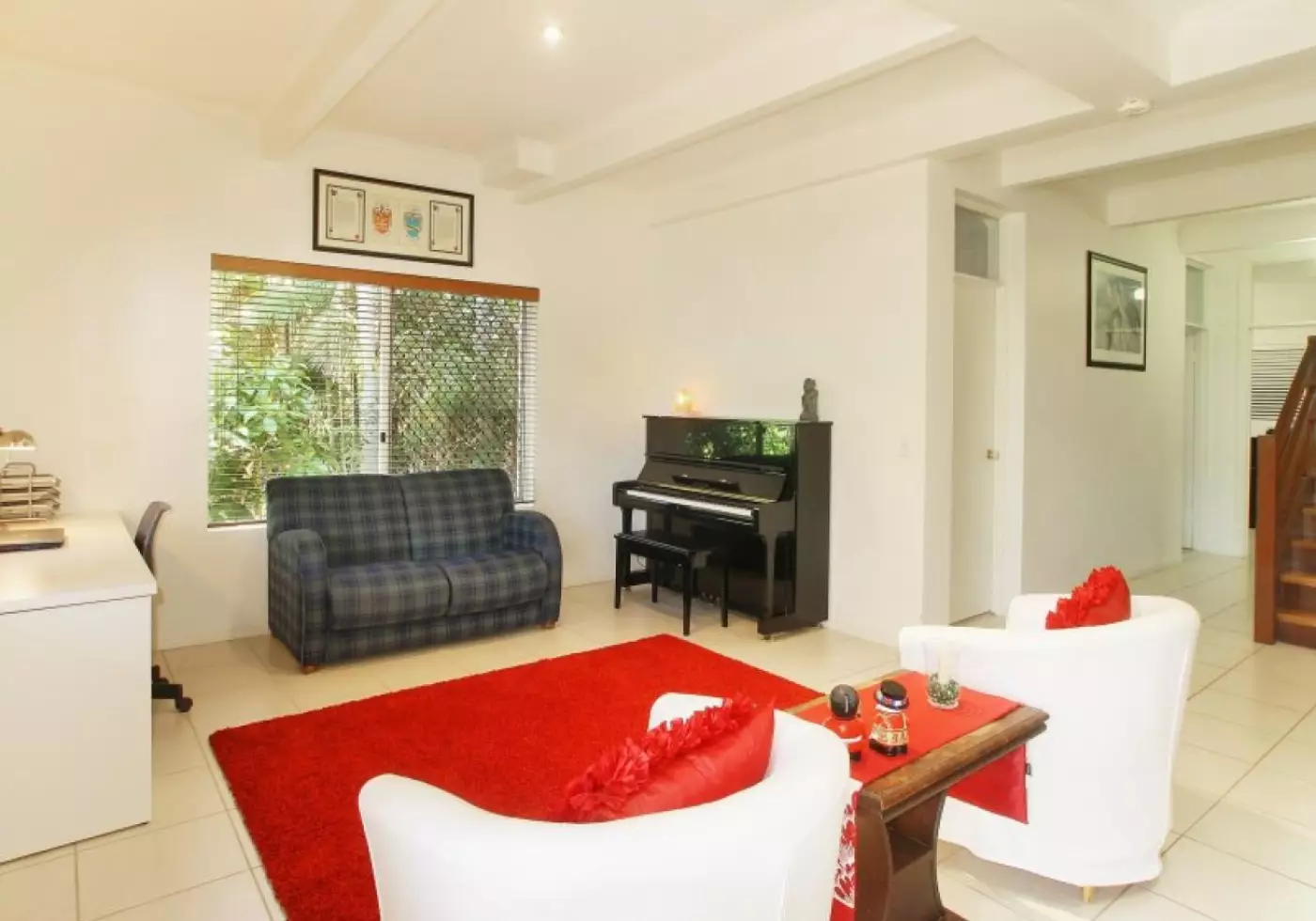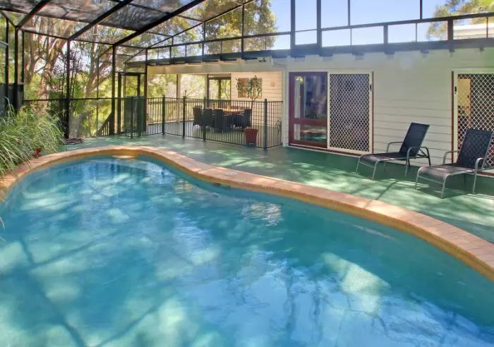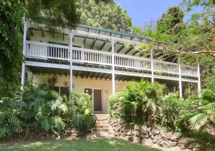 The home is high set and enjoys wide covered verandas on both levels. Upstairs the main living has raked ceilings through to a huge country style kitchen. Flow onto the veranda here for northern views to the mountains and into the sanctuary's forest. The kitchen also interacts with a separate screened entertaining deck overlooking the pool. For your comfort the solar heated pool is enclosed by a marvellous Florida room that screens the pool and decking from leaves and insects. Year round comfort with a majestic fig tree providing shade and Buderim's beautiful basalt boulders for an incredible backdrop to a totally private pool.