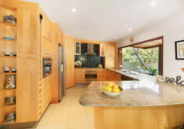 Commercial grade kitchen finished in a mix of figured sycamore laminate, granite benches, a Smokey black slumped glass splash back & a wide selection of storage spaces & drawers. Facilities include double bowl sinks, 6 burner gas cook top, electric oven, range hood, Asco dishwasher & built in coffee maker. A wide sit-up terrace bar with access from the kitchen bench echoes the relaxed indoor outdoor atmosphere of the living, dining & library areas.