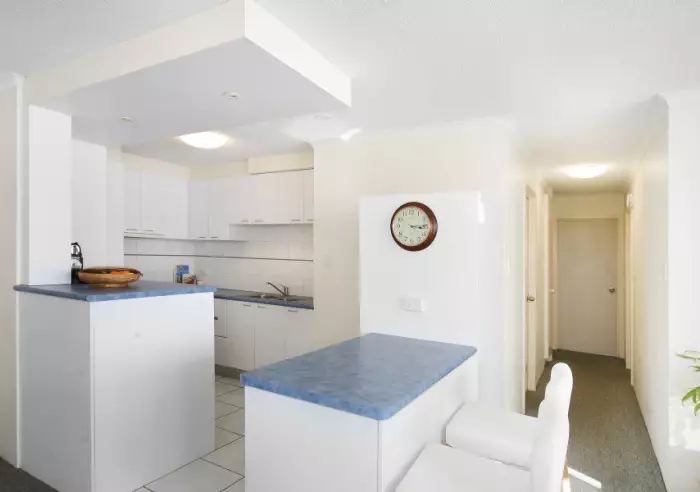 Accommodation Cleverly design to maximise living space, the unit has two good size bedrooms, one bathroom and secure parking for one car. The well proportioned kitchen is surrounded by an L shaped living area for clearly defined dining and lounge areas, both leading to the north east facing balcony with views to Old Woman Island.