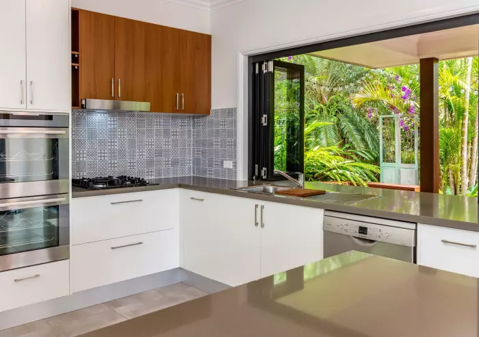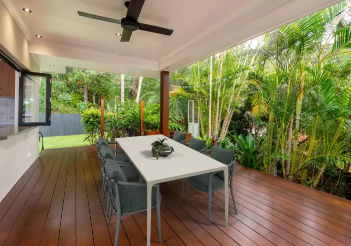- North facing Merbau timber entertainers deck with servery from kitchen