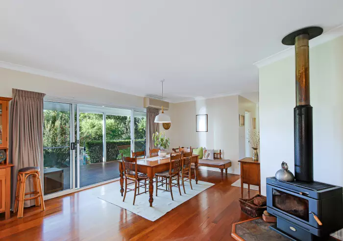 • Living area with a bay window, cosy wood fire, air conditioning, open plan to the kitchen and dining area