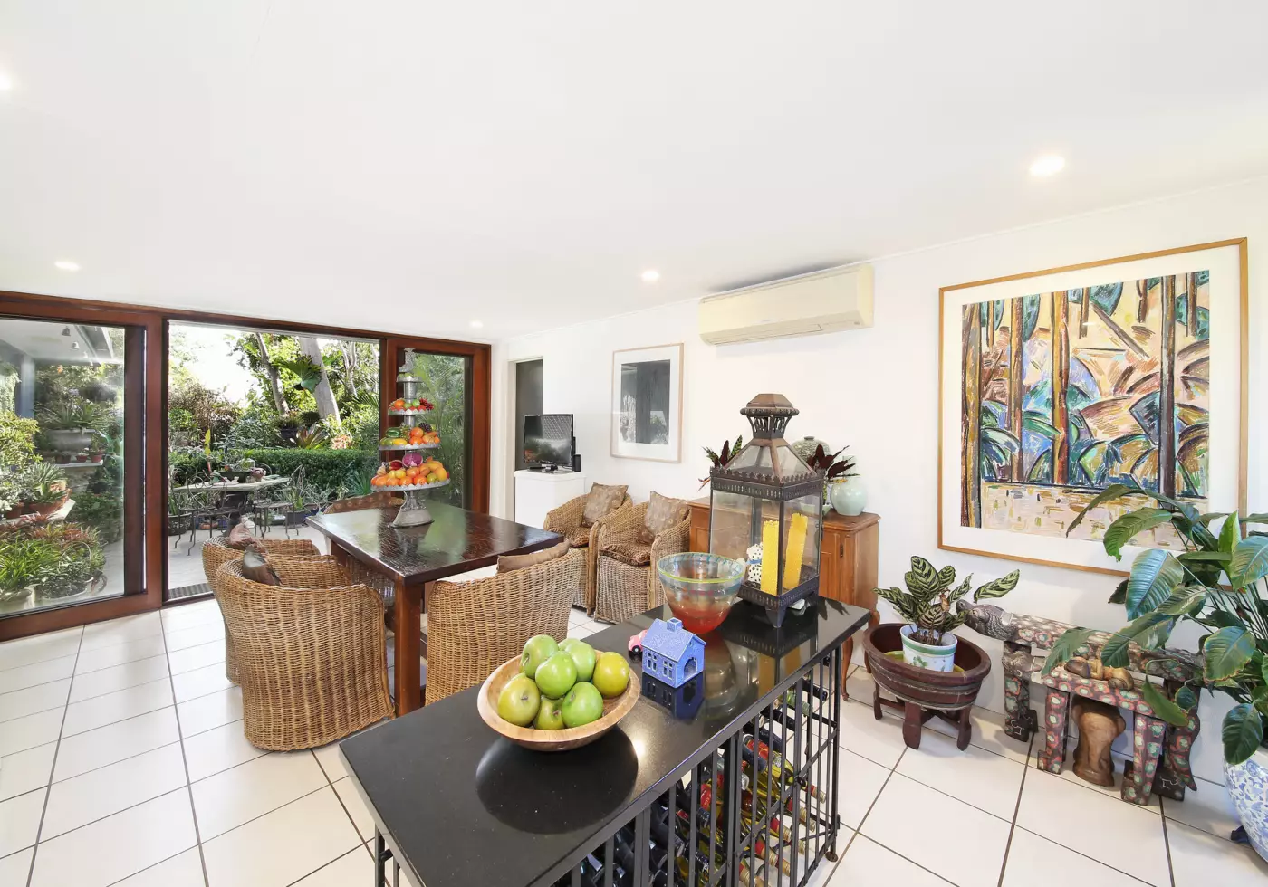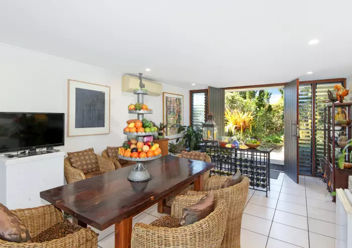 The main dining area has timber French doors that opens out into the outdoor garden with a picturesque setting.