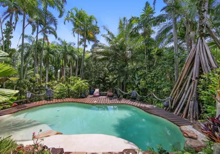 •Inground swimming pool surrounded by timber decking and outdoor shower. Watch for the amazing archway formed by the roots of an astounding pandanus!