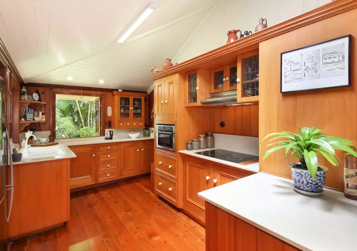 •Timber kitchen with stained glass windows, walk-in pantry and skylight