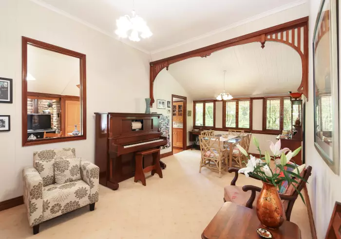 In keeping with the period of the home, classic touches throughout include soaring ceilings, polished pine floorboards, tongue and groove walls, timber framed windows and sills, various leadlight and fretwork panels above the doorways, elegant light fittings befitting the style of the home, and gorgeous timber archways.