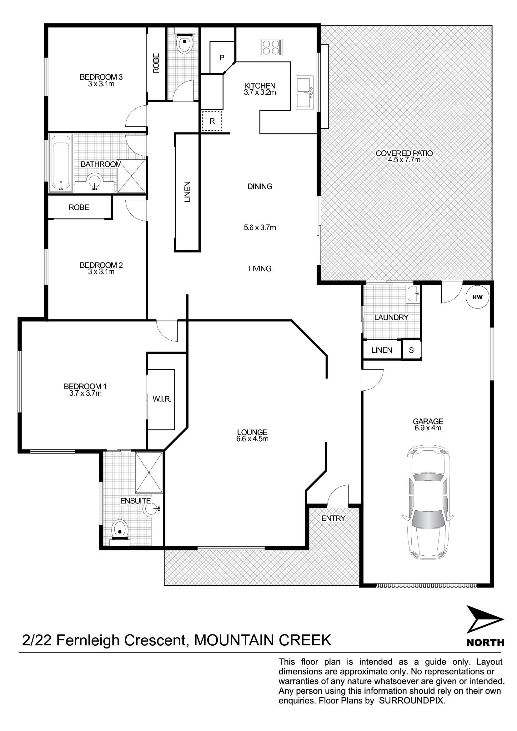 The main bedroom is spacious with a walk-in robe and ensuite, while bedrooms 2 and 3 are also sizable with built-in robes. The main full-sized bathroom has a separate shower and tub, and the toilet is also separate.