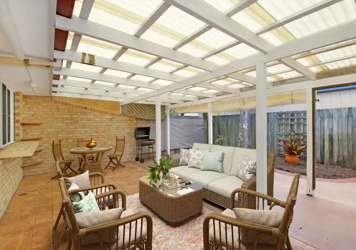 Adjacent to this is the functional kitchen with ample cupboards, a pantry and dishwasher. A large window with servery bench from the kitchen overlooks the huge outdoor undercover entertaining area – great for family gatherings and BBQ's – with added roll-down blinds for additional privacy and weather protection.