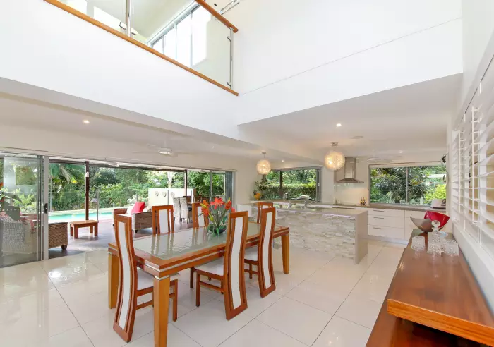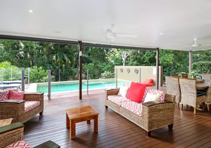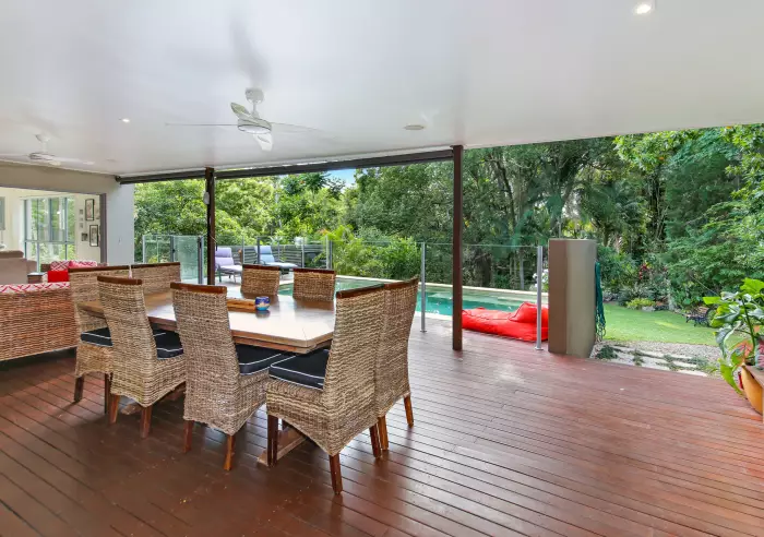 •Timber shutter bifold doors separate the large air-conditioned family room with panoramic windows overlooking the backyard and rainforest
