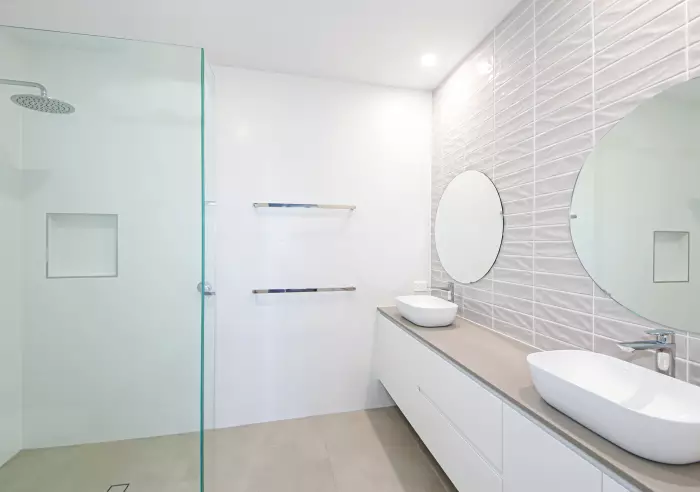 Floor to ceiling tiles in bathrooms with custom vanities