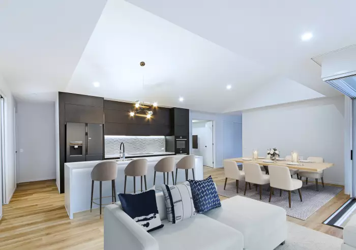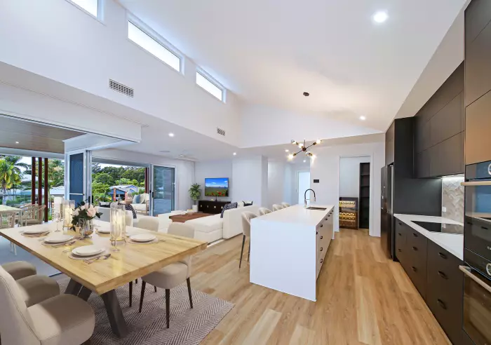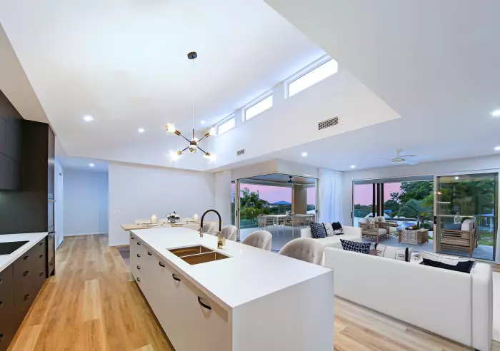 Conceptualised as the ultimate entertainer, the flow from indoor main living to the most incredible al fresco area and pool deck is truly remarkable. A centrally located media room sits adjacent to a stylish galley style kitchen and butlers pantry, with raked ceiling flowing natural light into the main living.