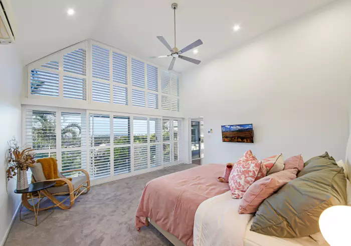 - Exceptional master suite with gorgeous en-suite, vaulted ceilings, beautiful plantation shutters and expansive ocean views.