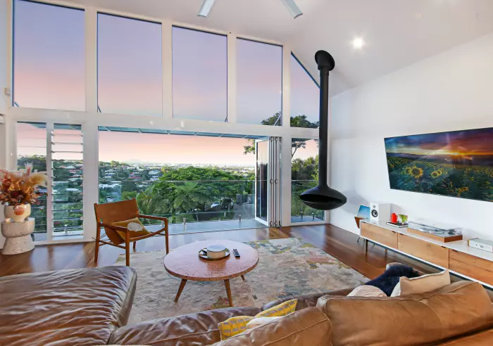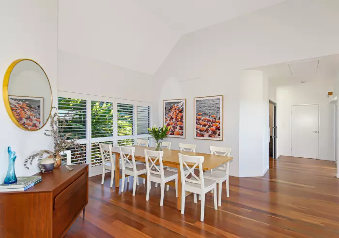 - Main living area has enormous ceilings, stunning spotted gum flooring, elegant suspended fireplace and aluminium bifold doors to take in the magical ocean views