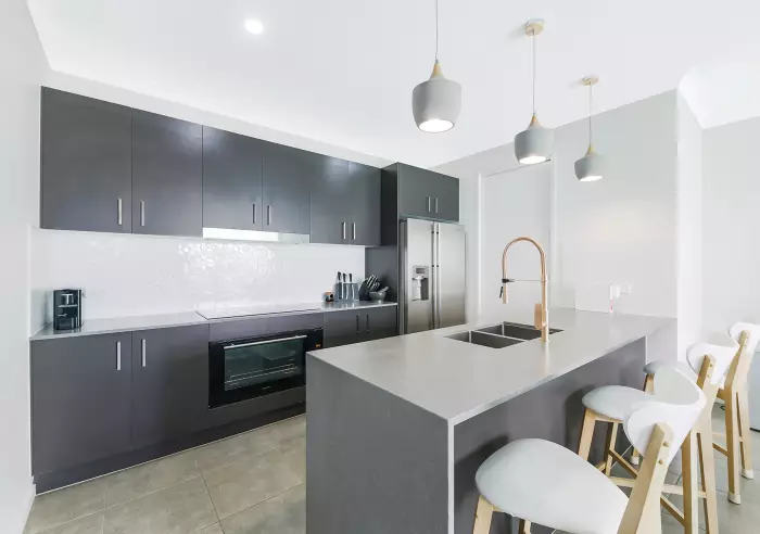 - Galley-style kitchen with TechniStone waterfall edge benches, premium appliances and butler's pantry