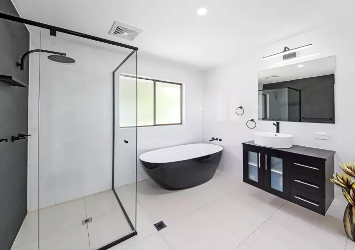 - Stunning bathroom with floor to ceiling tiles with a luxurious deep bath to relax