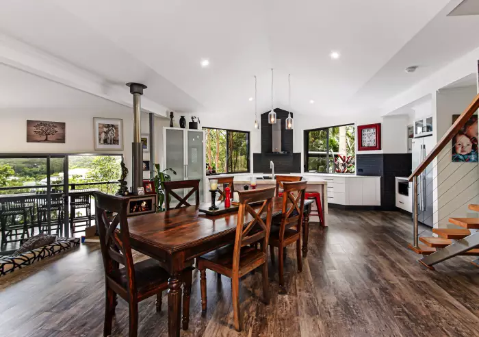 - Timber look flooring throughout air conditioned main living with vaulted ceilings and wood burner fireplace