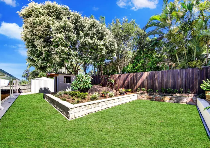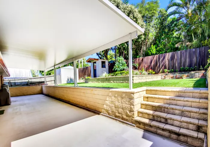 Recently renovated back yard with a sandstone brick retaining wall separating the rear of the property and the large functional under cover entertaining area. This space offers endless opportunities, including easy entertaining with friends and family alike.