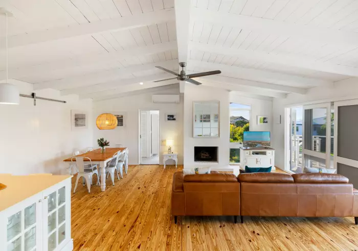 Upstairs is an immaculately maintained open and airy 3 bed 2 bath residence with office, that has been lovingly renovated by its current owners. Entering the main living area, your eyes are instantly drawn to the pitched high set ceilings, with exposed beams. This statement piece flows through to the large master bedroom and ensuite.
