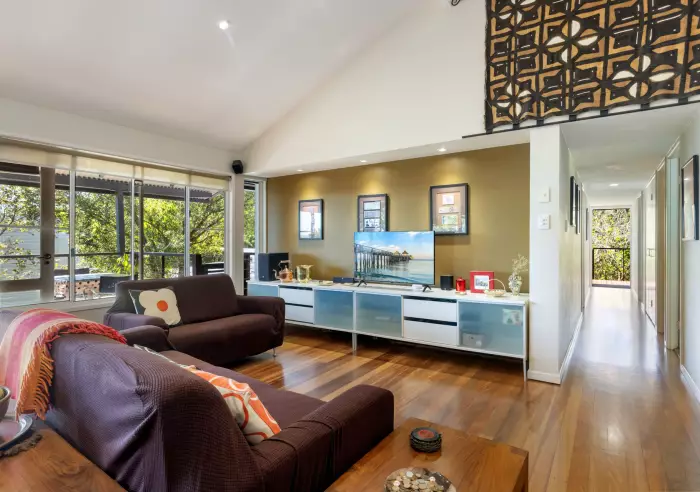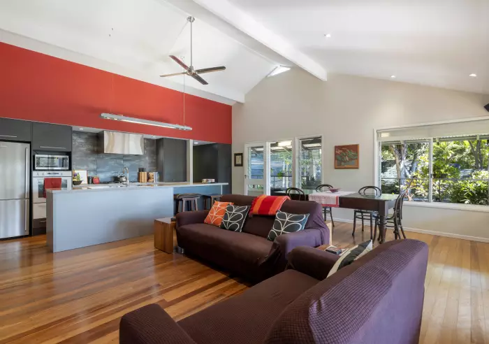 The main living area consists of polished brush box timber floors, pitched ceilings and an open plan living design, with formal dining and lounge area that seamlessly flows onto the wrap-around deck that looks at Mt Coolum.