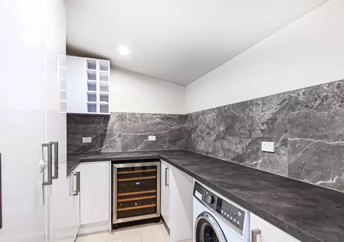 The kitchen is spacious and well-equipped with high end appliances, waterfall countertops, and ample storage space. The open-plan design seamlessly connects it to the dining area.