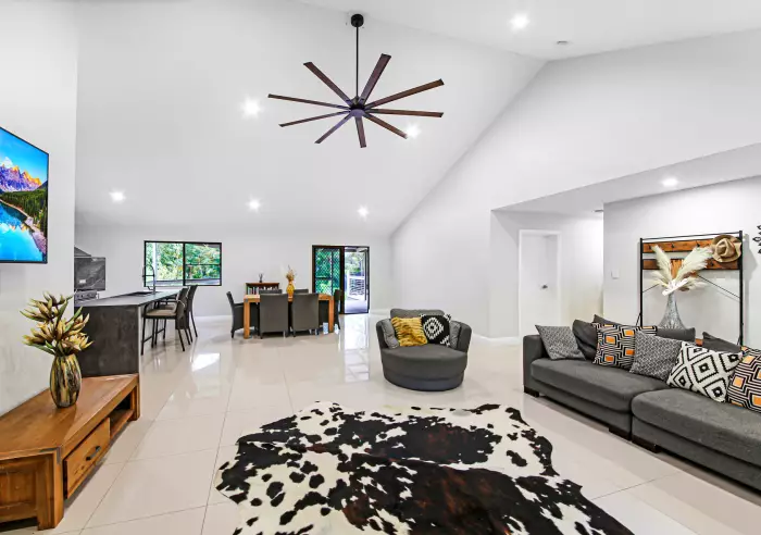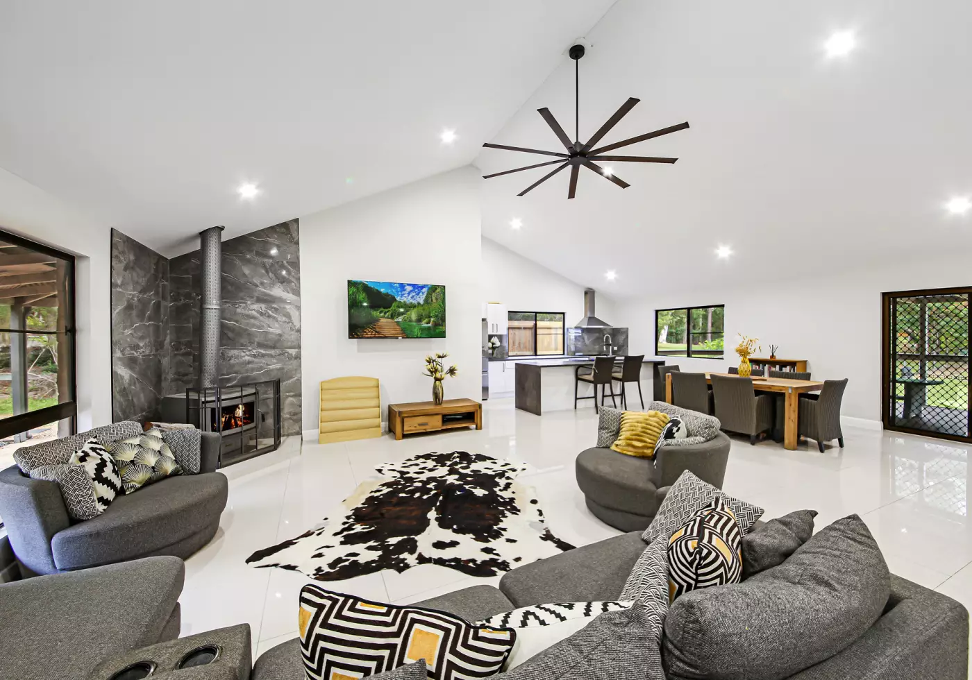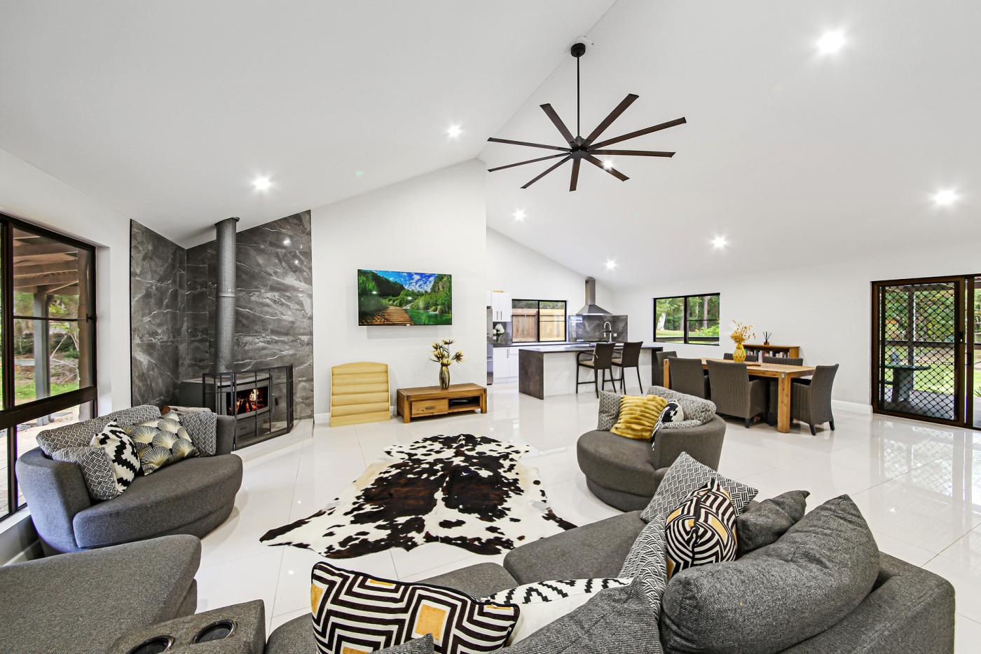 A beautiful living room with large windows overlooking the serene Mooloolah Valley. The room is tastefully decorated with modern furniture and gorgeous high ceilings to give the feeling of space.