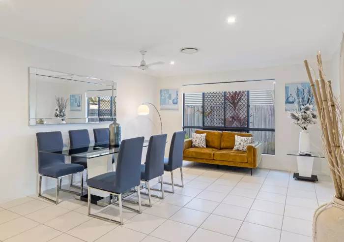 Positioned in an elevated tranquil cul-de-sac, this contemporary family home located in the highly desirable Rainforest Sanctuary Estate offers a combination of comfort, style, and functionality. The 320m2 residence boasts 4 generously proportioned bedrooms, a home theatre where families can enjoy their favourite movies and three additional living areas. The master suite features walk in robe, and an elegant en-suite bathroom with a spa, providing a private sanctuary for parents.
