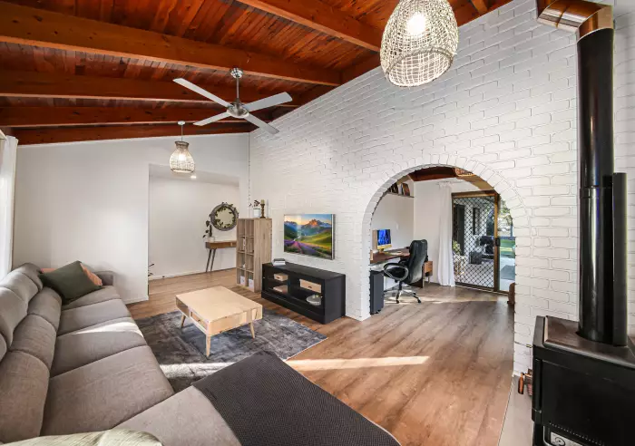 The home exudes warmth and charm with its high vaulted timber ceilings and brick feature walls, complemented by a cozy wood fire. A dedicated study area ensures a quiet space for work or reading.