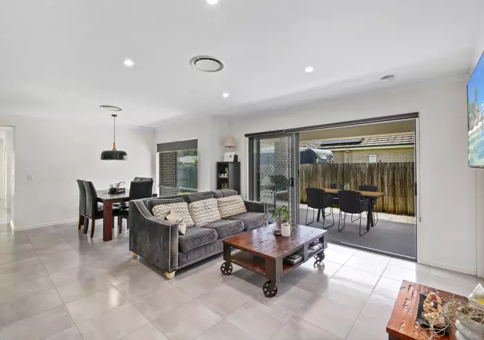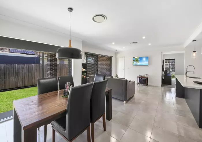 Designed to embrace indoor-outdoor living, the home's thoughtful layout connects the alfresco entertaining area with the interior spaces, ensuring a seamless flow. The heart of the home is the open-plan living area, bathed in natural light from expansive windows and enhanced by premium finishes throughout.