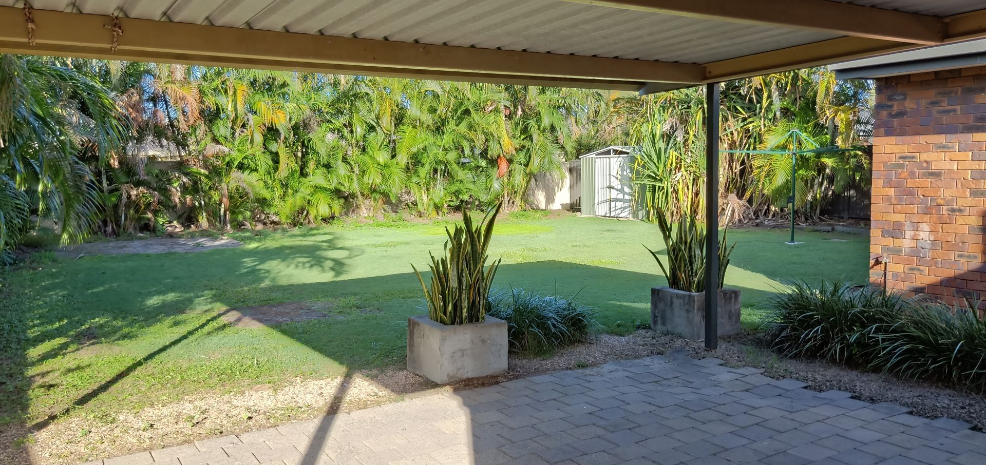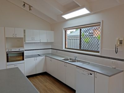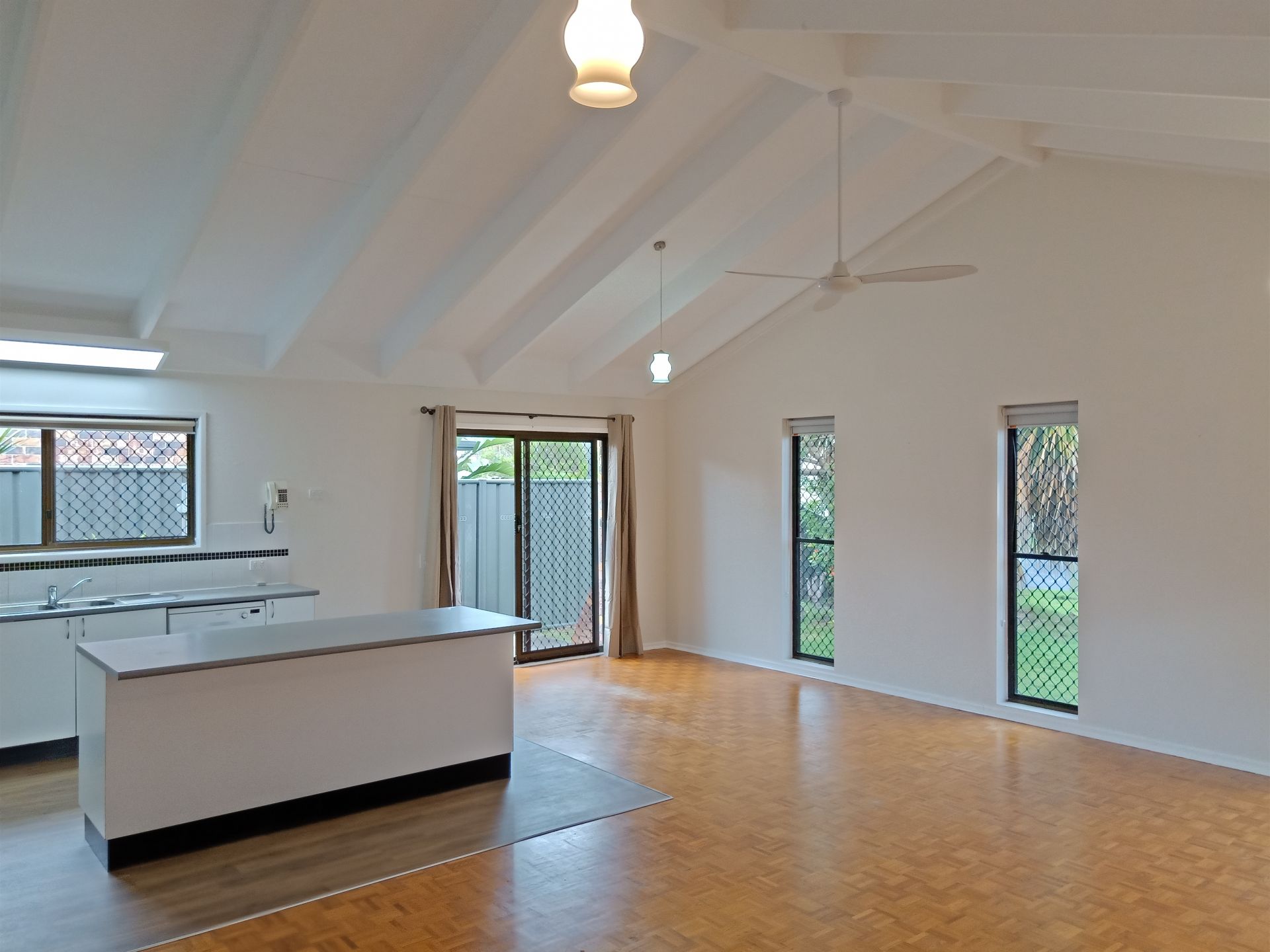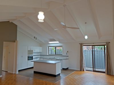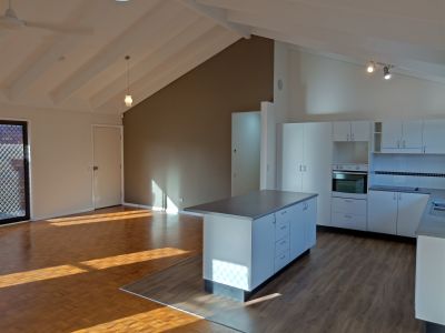 There are three bedrooms, all with ceiling fans and wardrobes and the master bedroom has sliding door access to the yard; the bathroom is nearby with a bath and separate toilet. The living area is a good size enabling an open plan for the lounge, dining and kitchen and the cathedral ceilings making the room feel larger, and nice and bright. The kitchen has an island bench, dishwasher and breakfast-bar area for stools. The yard is full enclosed with a pergola area for outdoor entertaining and there is a garden shed as well.