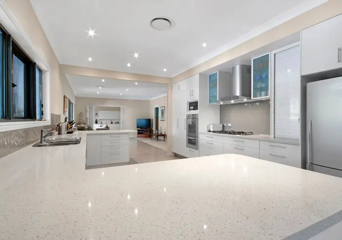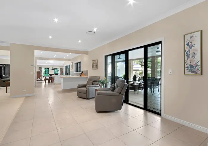 At the centre, a generous kitchen with Caesarstone benchtops overlooks the living and alfresco areas. Four tinted glass doors open to a substantial 120m² covered alfresco space under the main roofline, complete with built-in BBQ, ceiling fans, and outdoor speakers.