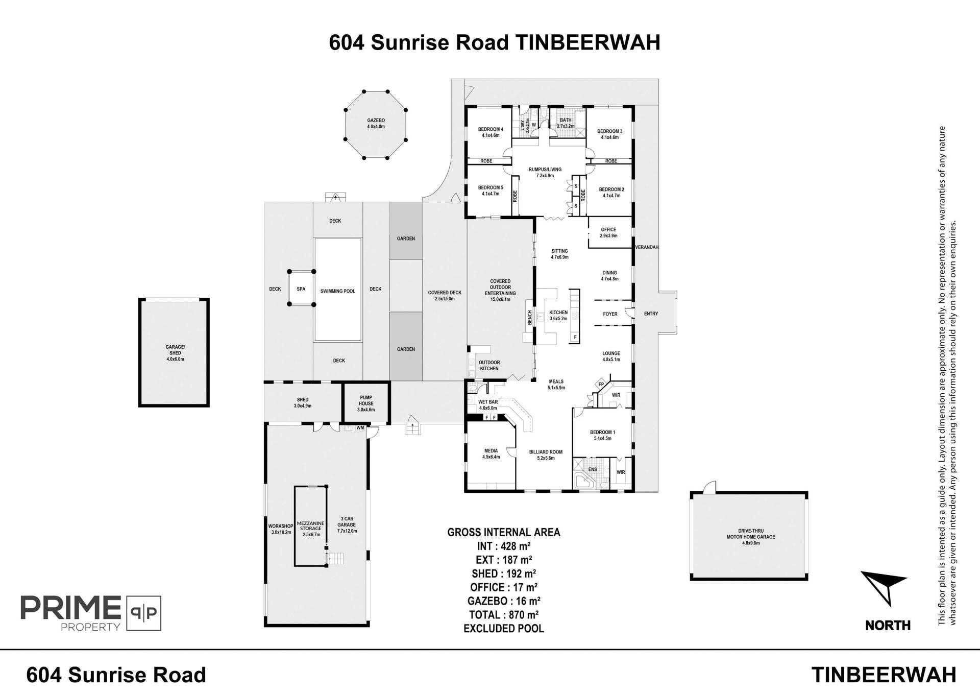 The sense of size is complemented by a drive through secure garage perfect for the largest of motorhomes or caravans. The main barn-style shed sits adjacent to the pool deck and has 3-phase power, mezzanine storage, and workshop space.