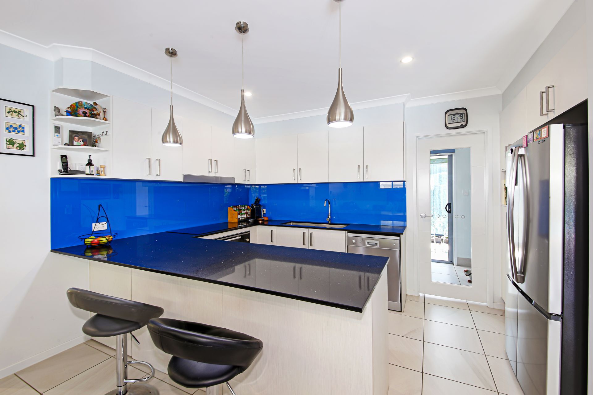 •Entertaining is made easy in this kitchen with plenty of bench space, caesar stone bench tops, a beautiful glass splashback, 900 Electric oven and cook top, plumbed in refrigerator, dishwasher and plenty of cupboard space